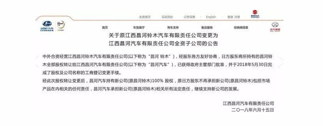 6月15日,北汽昌河网站首页发布《关于原江西昌河铃木汽车有限公司变更为江西昌河汽车有限责任公司全资子公司的公告》。公告显示,铃木将正式从江西昌河铃木汽车有限责任公司中完全撤资。6月19日,铃木和长安汽车谈判解散合资公司长安铃木,铃木汽车将在中国停止生产。