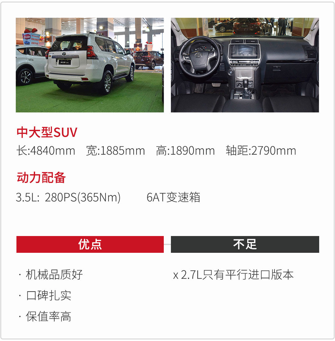 最后一款车型,可能是大家最为熟悉的。普拉多凭借着不错的机械品质,一直“走南闯北”,被大家所熟知。在进藏的一些复杂道路上,经常看到普拉多的身影,从另一方面体现了普拉多不错的产品特性。更加适合带家人出去,舒适性与可靠性都不错。
