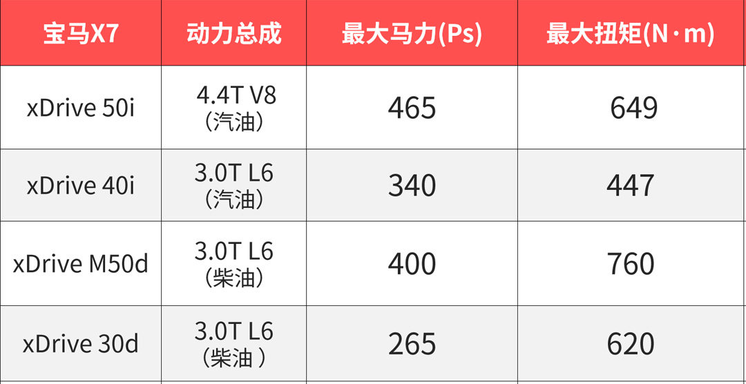 在动力方面,宝马X7将根据地区的不同而提供4款不同性能和取向的发动机。