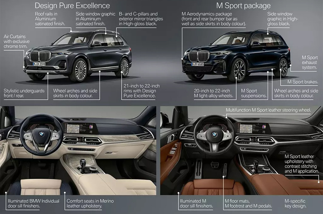 X7提供了Design Pure Excellence和M Sport package 两个版本的车型,它们不光在外观上有明显差异,内饰中的座椅皮革、仪表台饰板等都会有截然不同的造型和配色,满足用户的个性化需求!