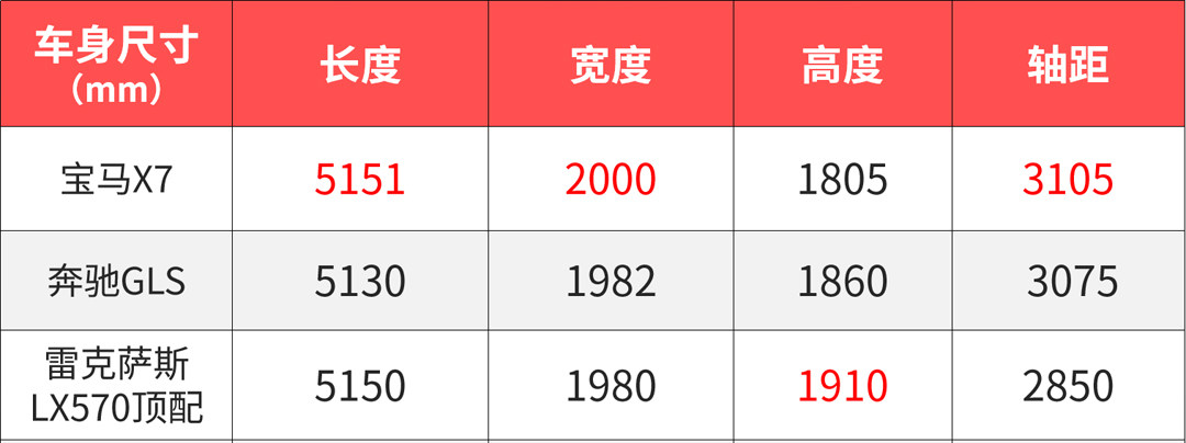 从车身尺寸来看宝马X7比起同级车型在长度、宽度、轴距上都是有一定优势的,同时它的车身高度也是最低矮的“仅仅”只有1805mm,可见它更像把高端豪华与运动感结合在一起!