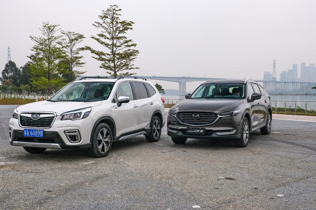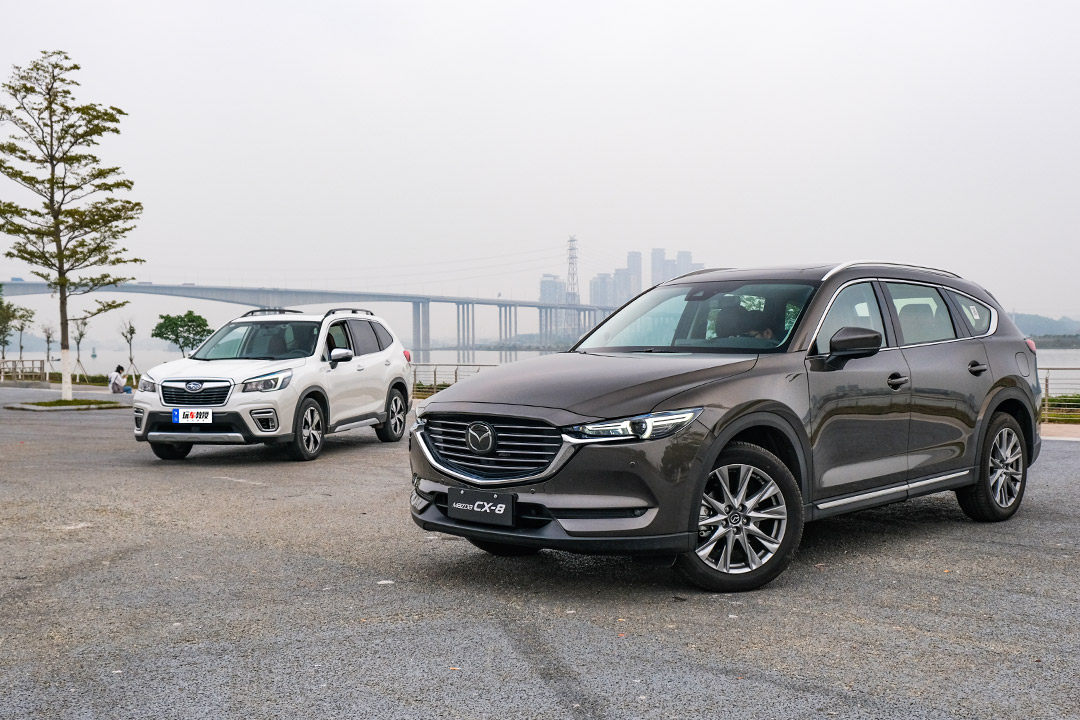 首先说说两款车的基本信息,马自达CX-8是2.5L顶配车型,指导价33.08万,属于中大型SUV;而森林人这边是2.0L轻混的顶配,也是前一阵子才加入的轻混动力,指导价28.58万,是紧凑型SUV,在此只做差异对比,不分高下。