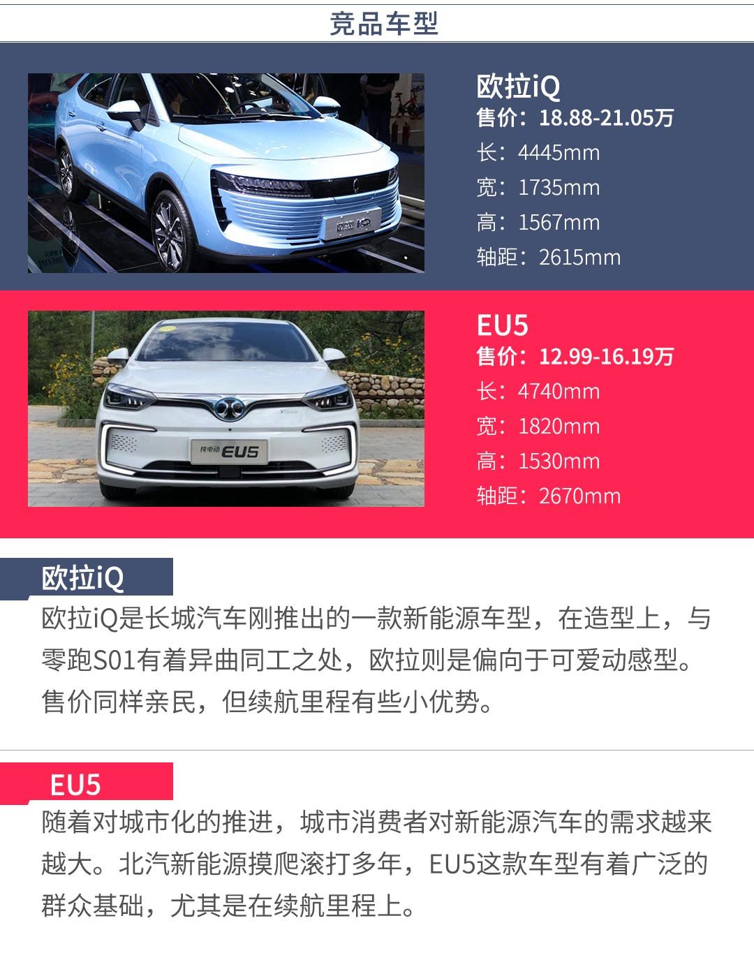 从零跑的车型定位及售价来看,其实在目前的话,是没有直接竞争对手。但根据在售车型的价格,欧拉iQ和北汽新能源EU5等车型会比较接近些,欧拉iQ可能在造型上与零跑S01有异曲同工之妙,补贴后的价格也尤为亲民。当然,除此之外,在10万-15万价格区间的纯电动车型,还有很多竞争车型,价格也是消费者选择车型的关键因素。