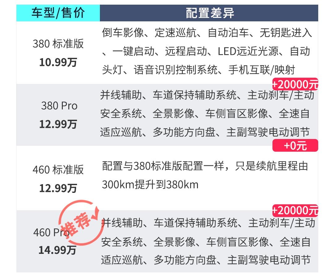 共有四种车型配置选择,每种车型的差别也非常直接了当。严格来说,可以分为两种车型配置。标准配置和Pro配置,在车身内饰配色、主动安全性配置、舒适性配置等来区分。460版本车型更像是380版本车型的复制版,只是电池容量和续航里程不同,有300km和380km两种不同续航里程。