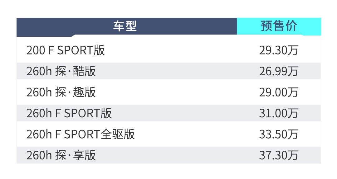 新车作为雷克萨斯家族最入门的一款SUV,目前已经开启预售,共推出6款车型,预售价区间为26.99-37.30万元。从预售价来看,新车还是非常吸引的,但具体表现如何?到底有哪些值得期待的?请让教授带你进一步了解。
