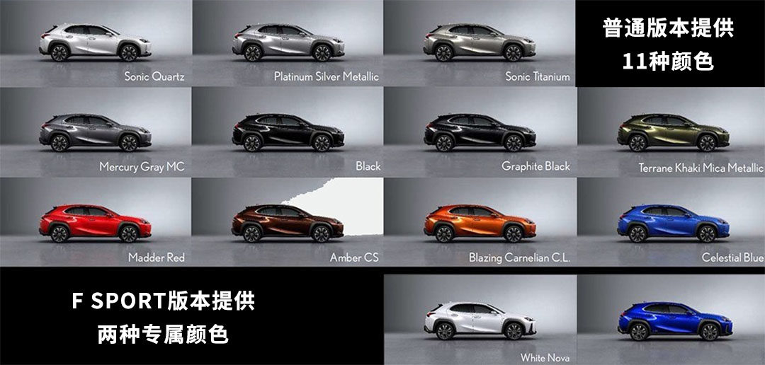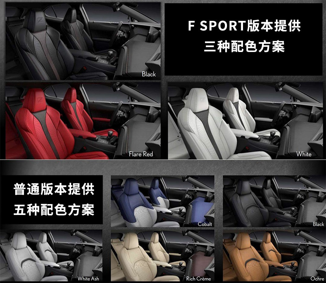 至于内饰的颜色搭配,UX同样提供多种选择,包括F SPORT版本的3种颜色,和普通版本的5种颜色。所以总的来说,雷克萨斯UX带给我们更多的还是视觉上的享受,和高质感的体验。当然,动态表现也是值得期待的,特别是主推的混合动力版本,总体平顺性和噪音控制都比NX300h提升不少,具体表现请期待我们的试驾评测吧。