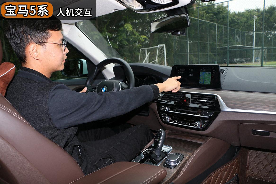宝马5系,触摸屏加触控板控制。司机表示宝马5系的这套操作上手难度不算高,如果老板可以选装手势控制那就更好玩了。(老板表示:想得美)