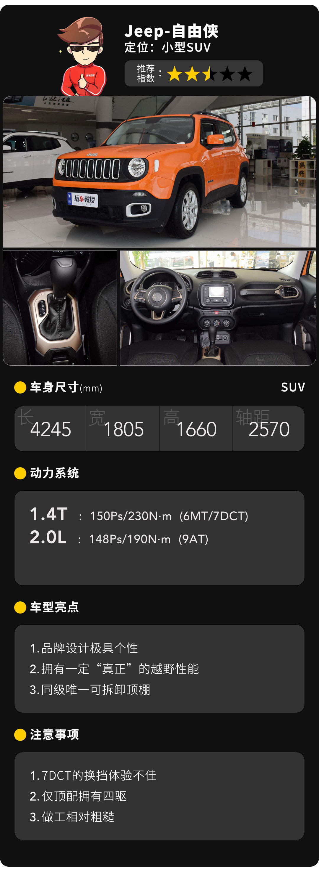 在国内,A0级的入门小车除了那几个“天赋异禀”的,基本上凉的差不多了。尺寸小就是原罪,不服憋着。但是呢,市场有总会弄出些“两开花”的事情,小型SUV,尺寸不见得特别大,但是人家有了高车身啊,内部可用空间一下就大了不少,同时有了“SUV”的名头,怎么看都比之前那些A0级小车要好吧,重要的是:小型SUV的价格并不算高。再配上“年轻时尚”这个关键词后,这个细分市场成为了SUV圈中的新宠。教授今天想说的,就是小型SUV中最特别的那个——Jeep自由侠,尺寸不大,面子不小。
