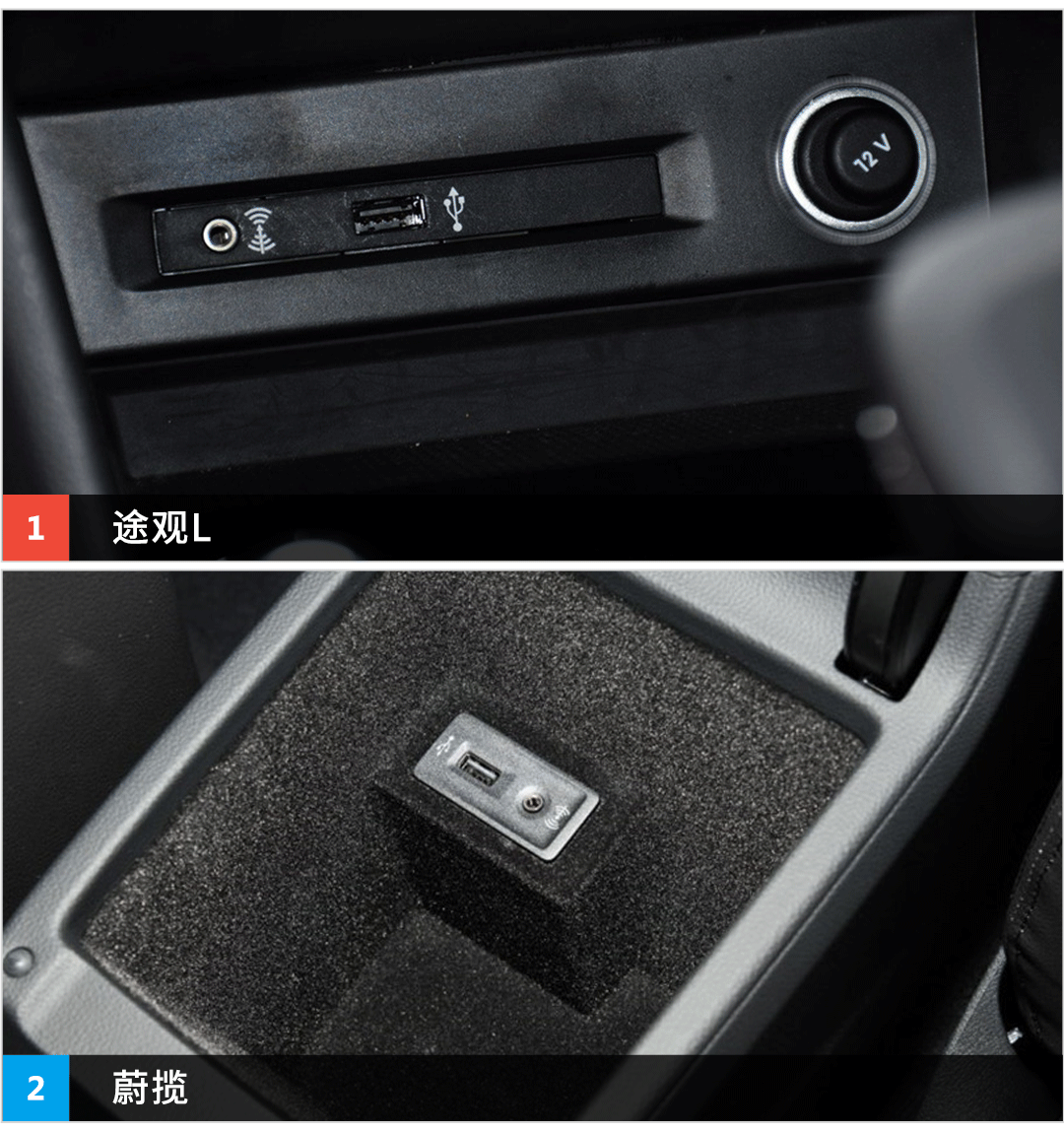 途观L把前排USB和AUX接口都布置在了中控台下方,使用相对更加便利,而蔚揽则布置在了中央扶手箱里面。