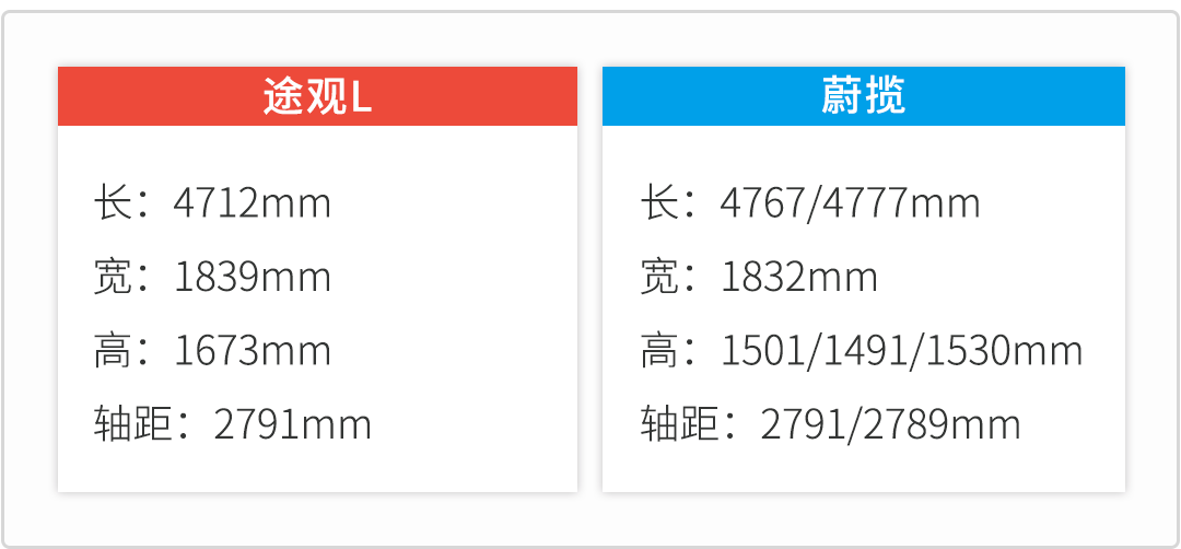 外观:途观L的SUV造型高大威猛,符合传统国人审美;蔚揽的旅行车造型优美修长,欧洲味十足