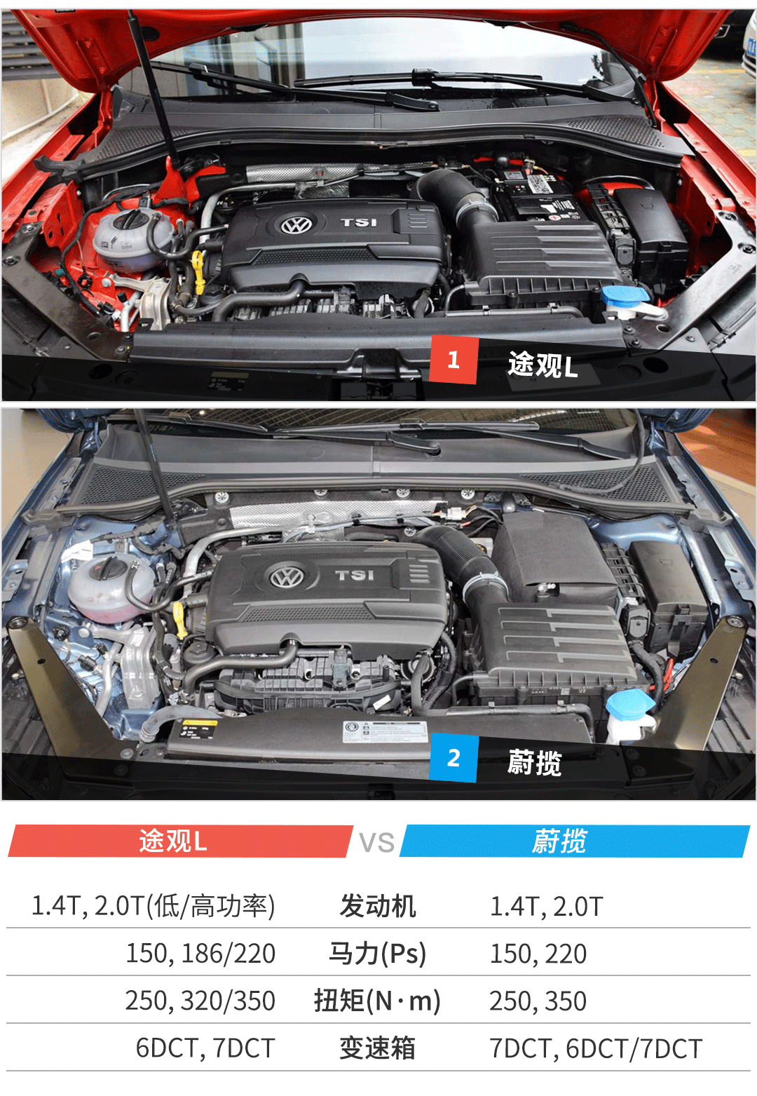 同为大众旗下车型,自然动力系统也是高度共享的,EA211和EA888两款发动机和双离合变速箱自然也是跑不掉。而在具体动力配置推荐上,途观L的2.0T低功率两驱版车型在动力足够的前提下,性价比相对较高,而蔚揽则更加推荐购买匹配6速双离合变速箱的2.0T两驱版车型。此外,两款车最好都不要购买1.4T版本,小马拉大车,动力感受差,对油耗也不利。而四驱系统对于两款车舒适取向的定位而言,也稍显多余,不值得多掏钱购买。
