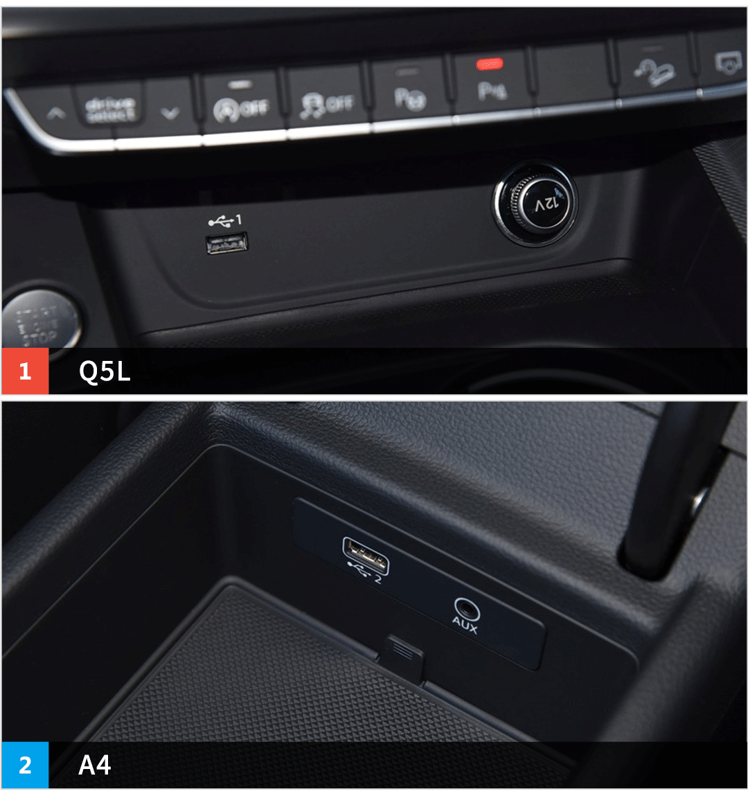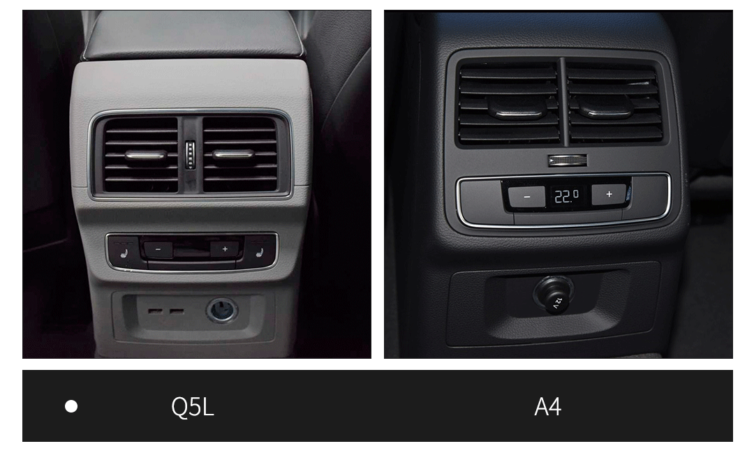 后排配置则明显看出Q5L做过本土化改良,不仅有空调出风口和12V电源,而且还有两个中国人最爱的USB接口,拿来给手机和电子设备充电就很方便。A4 Allroad却只有空调出风口和12V电源,后排乘客想给手机充电就必须另外购买转接头了。