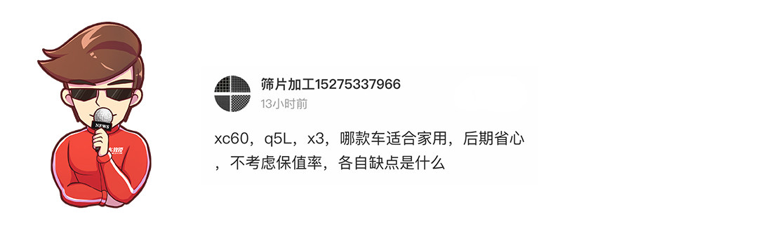 纵观三部车,沃尔沃XC60的表现是最为全面的,但后期保养以及维修的费用确实厉害;宝马X3的外观最张扬个性,但内饰感觉完全跟不上时代;奥迪Q5L永远都是在中间做着最中庸的位置,而这反而成为优点。如果是纯家用的话,后排空间最出色的奥迪Q5L会是更好的选择。