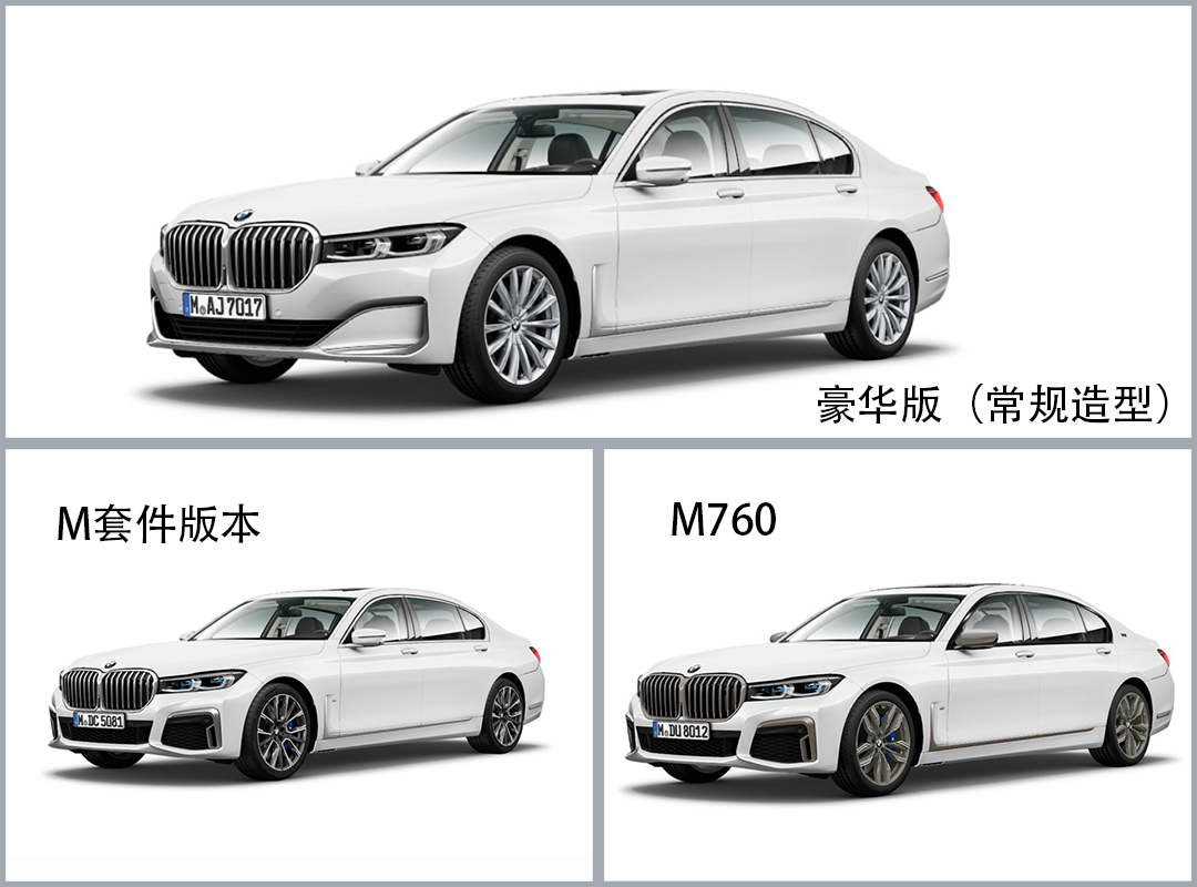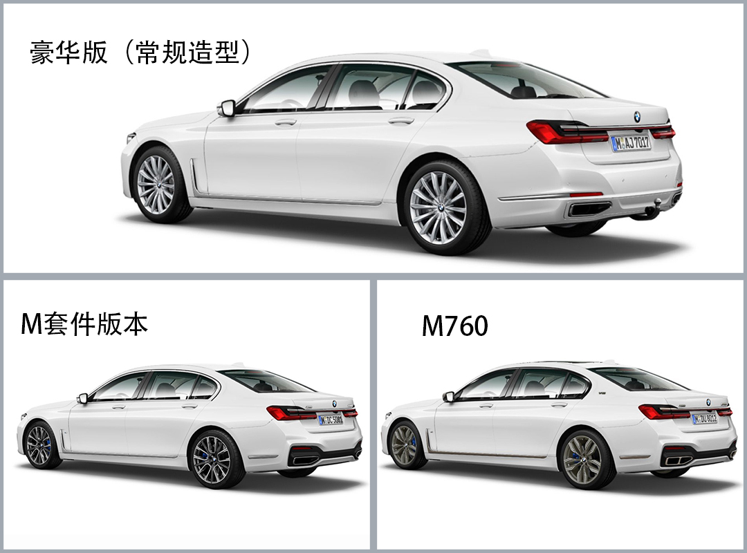 由于只是中期改款车型,新款7系的侧面并没有太多变化,重点在于车尾部分的改变。新款7系换上了代表了宝马最新科技的LED尾灯,相较于现款车型,内部的结构进行了进一步的优化,且造型也有所变更,与车尾的双出排气相结合,将运动氛围和大气感衬托得更为到位,同时新车也提供M套件版本供消费者选择;M套件版本的外观造型与普通版本有着更夸张的前保险杠,但与顶配车型M760的主要区别在于,M760的C柱有表明身份的V12标识以及双边四出的排气,M套件版本仅为双边共双出排气的形式。