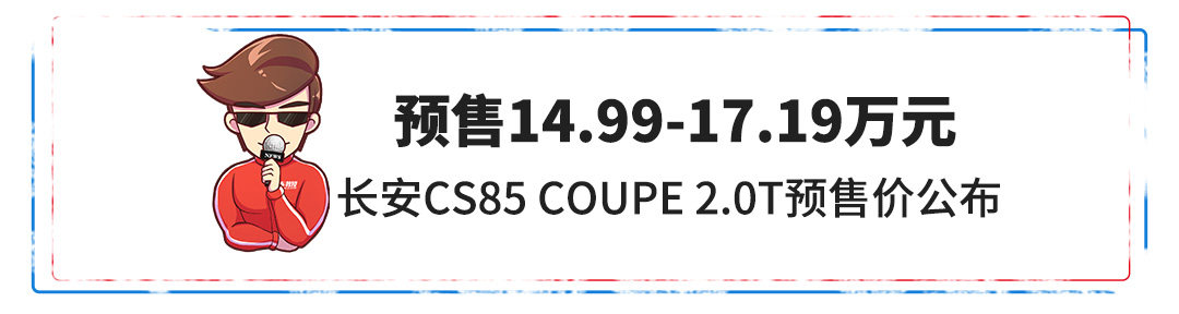 日前,长安汽车正式公布了长安CS85 coupe 2.0T 的3款车型的预售价格,预售价格区间为14.99-17.19万元。据悉,新车将于2019年上半年上市销售,届时将提供1.5T以及2.0T两种动力。从此次公布的2.0T车型配置信息来看,整体配置比较丰富,标配集成式车身电子稳定系统、直接式胎压监测系统等。以目前2.0T的预售价推测,长安CS85 coupe 1.5T车型未来的起售价有望在13万元左右,最终售价能否带来惊喜?拭目以待。