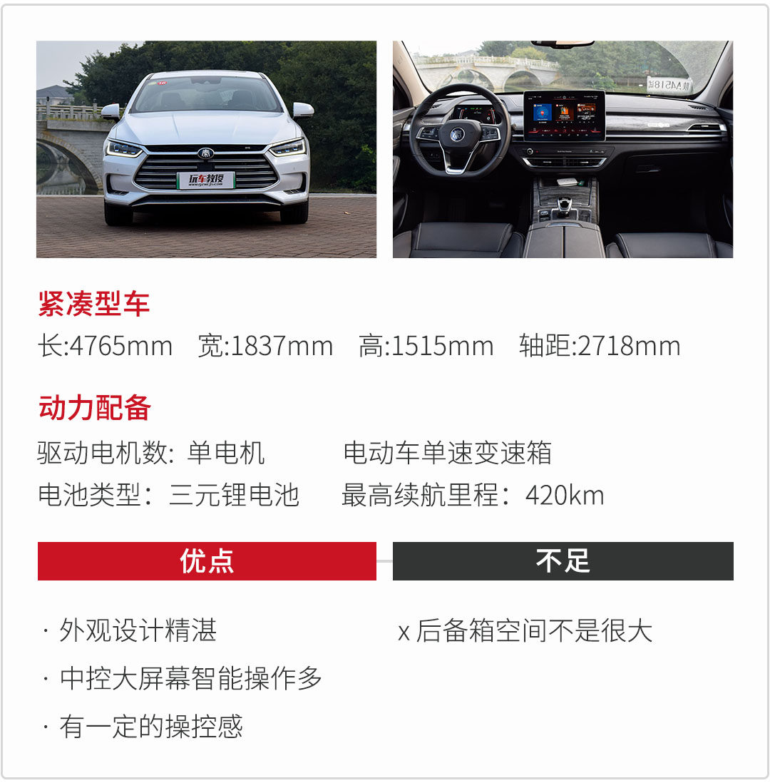 秦Pro新能源,共有DM插电版和纯电动版本车型选择。两者都有着不错的外观设计及科技观感的内饰等,420km较长续航里程则是纯电动车型的优势。当然,DM版本的80km续航里程也非常不错。在纯电动轿车领域,秦Pro新能源的车身尺寸还占有一定优势,2718mm的轴距,车内空间较为富余。没有什么明显短板,在15万-20万的预算上,秦Pro新能源是消费者选择新能源车型的首选车型。为了突出区别,纯电动车型的后悬架有一定的升级,后悬架采用了多连杆独立悬架,在舒适型上,要优于插电版本车型。