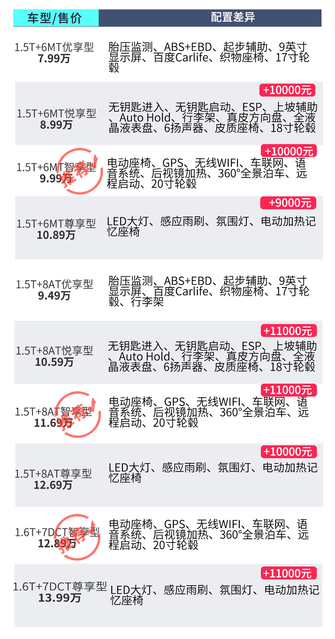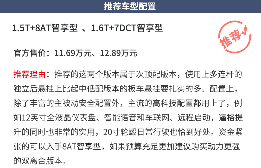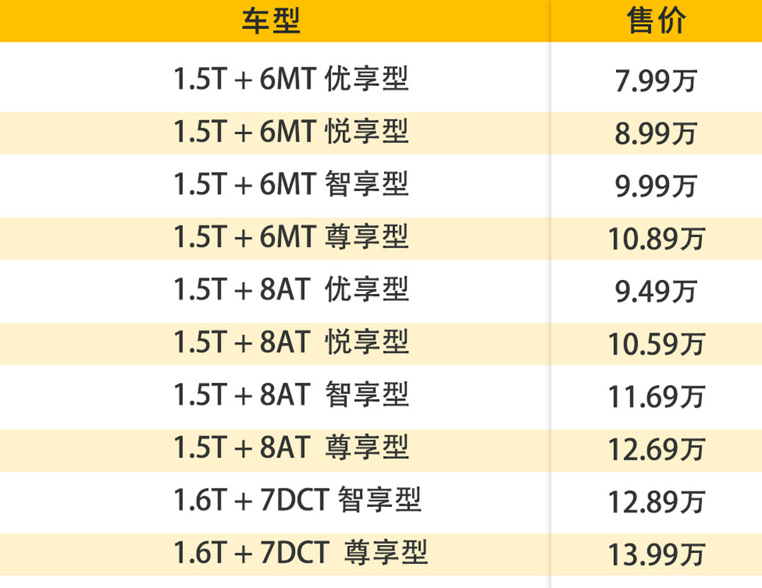 1.5T+6MT/8AT、1.6TGDI+7DCT三种动力组合十款车型为不同需求的用户量身打造。其中代号为F4J16的1.6TGDI是奇瑞最新自主研发的缸内直喷发动机,在燃油和动力上得到进一步提升。悬架方面,中低配版本使用前麦弗逊独悬+扭力式梁式非独悬,顶配和次顶配使用前麦弗逊独悬+后多连杆独悬。