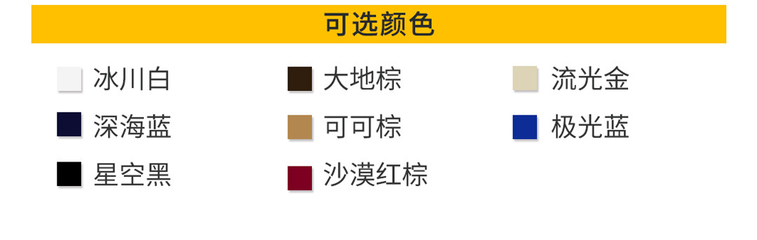 新车提供冰川白、大地棕、流光金、深海蓝、可可棕、极光蓝、星空黑和沙漠红棕共8个颜色可选,其中极光蓝和沙漠红色会更加适合年轻消费者。