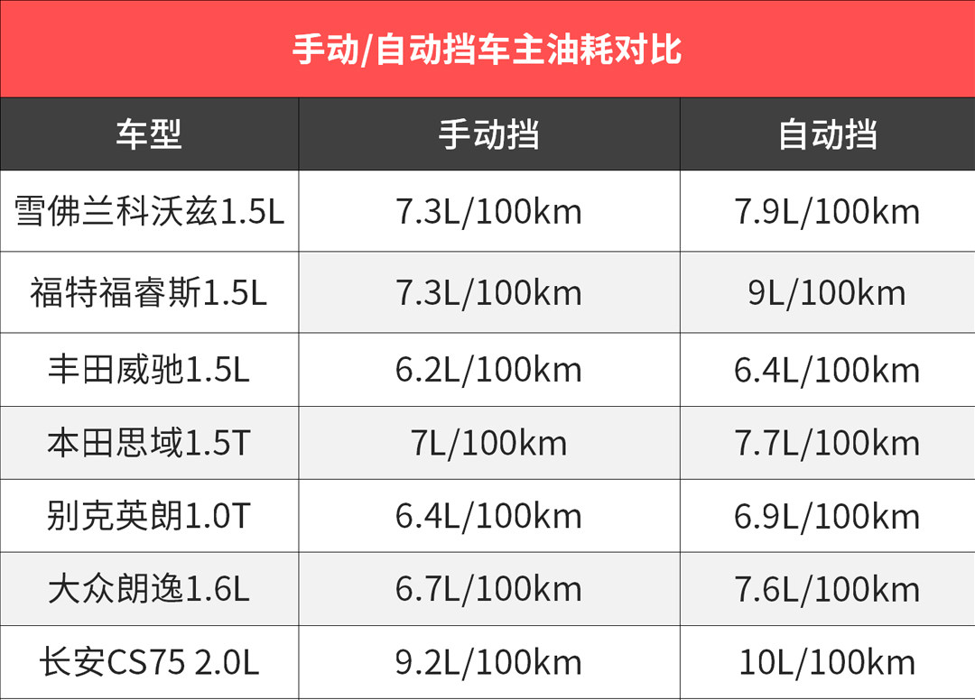 的确,自动挡开起来确实更加费油一些,教授简单统计了一下,自动挡车型油耗普遍比手动挡高出0.5-0.8升,即便是比较省油的威驰,自动挡也比手动挡高出了0.2升,不过对于新手来说,开手动挡却不见得比开自动挡省油。