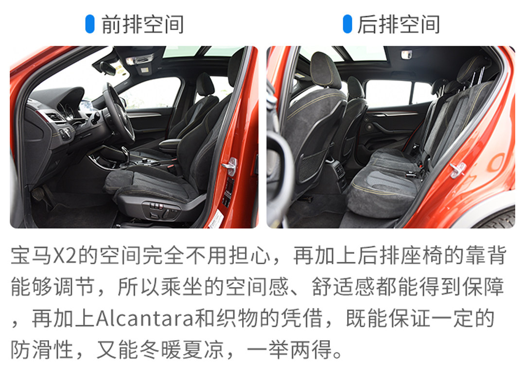 X2的尺寸和轴距介于Q2L与E-PACE之间,其空间表现相对捉紧,不过亮点在于,后排的靠背角度多级可调,同时有Alcantara和织物拼接的材质可选,既防滑,也冬暖夏凉。