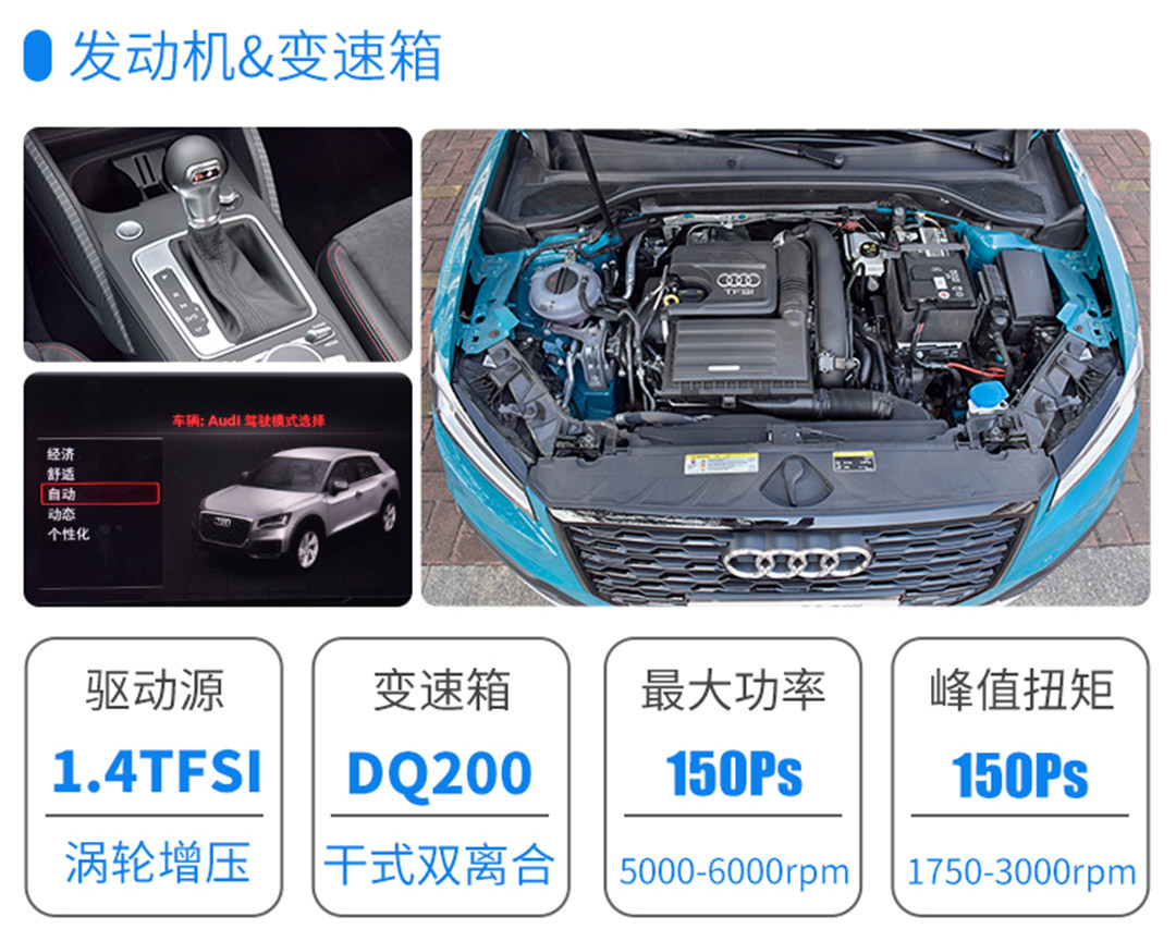 Q2L搭载了大众EA211系列1.4T发动机+DQ200七速双离合变速器,150Ps和250N·m的动力算不上强悍,但好在车身轻巧,S模式下输出畅快,所以开起来也有种身轻如燕的感觉。