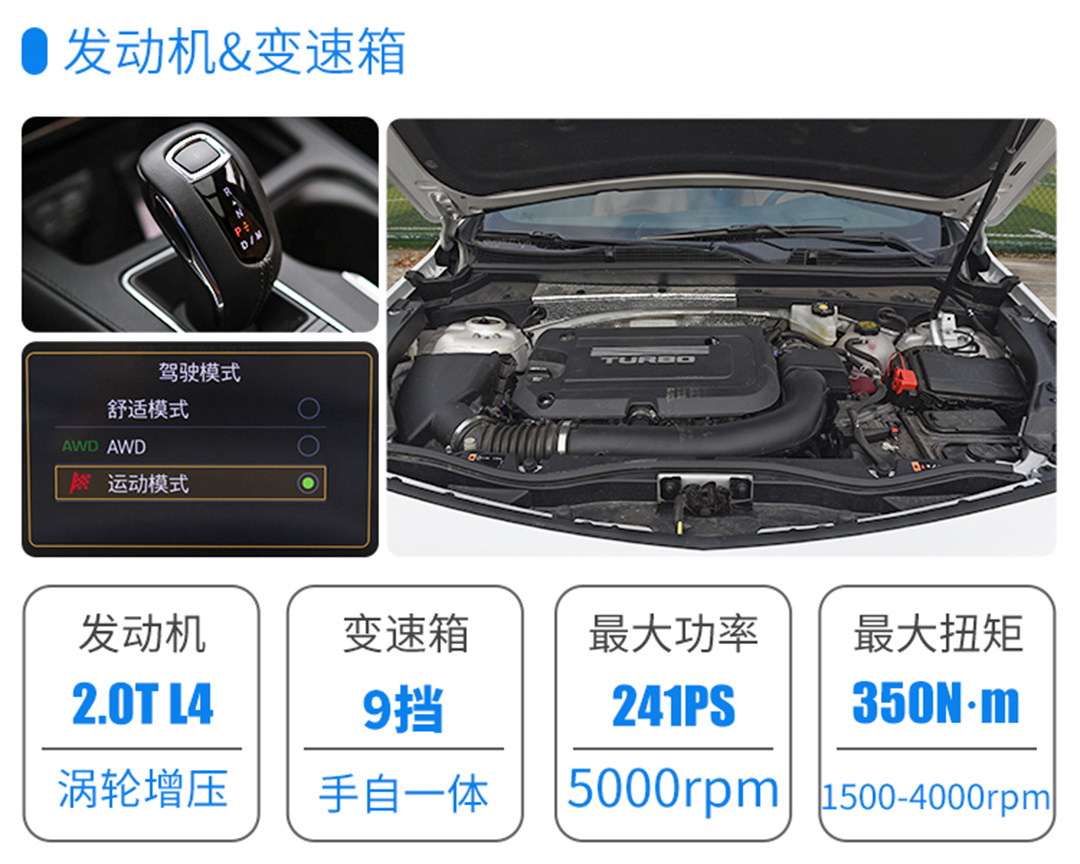 凯迪拉克的2.0T发动机有241Ps的最大马力和350N·m最大扭矩,不过匹配的是自家最新的9AT变速器,带四驱系统。