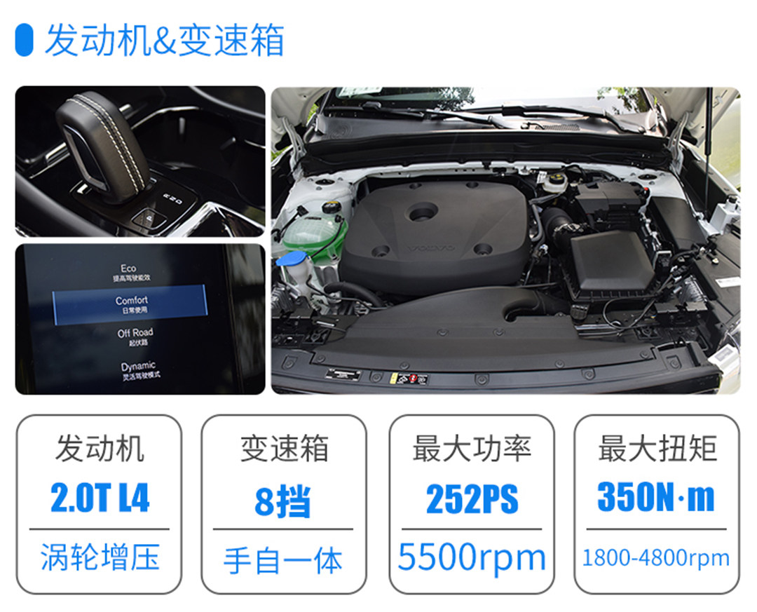 XC40的2.0T高功率发动机最大马力252Ps,最大扭矩350N·m,匹配来自爱信的8AT变速器。对于一辆小型SUV来说,参数十分可观了。