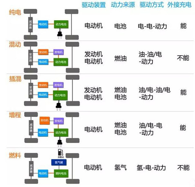 最后,通过以下的一张图片展现下目前各种新能源车之间的主要区别,前面内容看得不是很明白的网友们,可以看下下图,比较简单化: