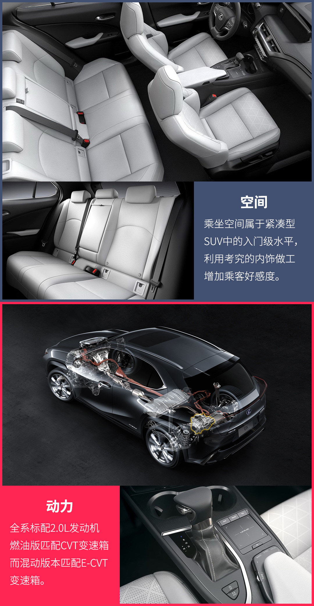 新架构下强调的是低重心、高刚性的新式造车理念赋予了UX低矮的坐姿和灵活的身段在行进过程中时常令人忘记其原本SUV的定位。稍显可惜的是全系提供的自吸发动机所能提供的动力支持有限未能为良好的操控性能带去多少正向的帮助,2.0L发动机无论是纯燃油版本207N·m的最大扭矩或是得到电动机辅助后合计257的最大扭矩。二者的动力储备与爆发性能都要逊色于同级装备涡轮的对手。这一点与C-HR颇为相似,而比C-HR多出的四驱与混动系统则是UX突出其豪华身份的重要砝码。