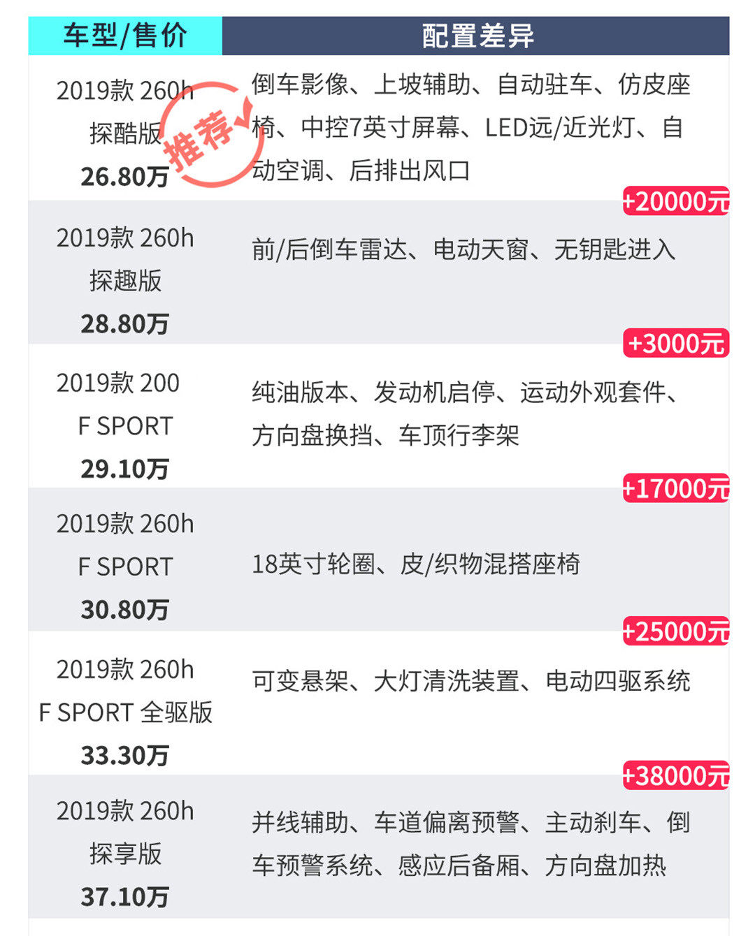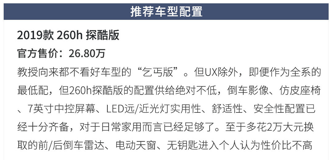 新车共有6个配置可供选择(其中5款是混动车型,仅200h F SPORT是纯燃油版),精简的数量令各档配置间的价格跨度适中选择起来不会过于繁琐,那么究竟哪一款配置更具性价比;UX又是否真的是“豪华版C-HR”?欲知真相如何且听教授慢慢道来。
