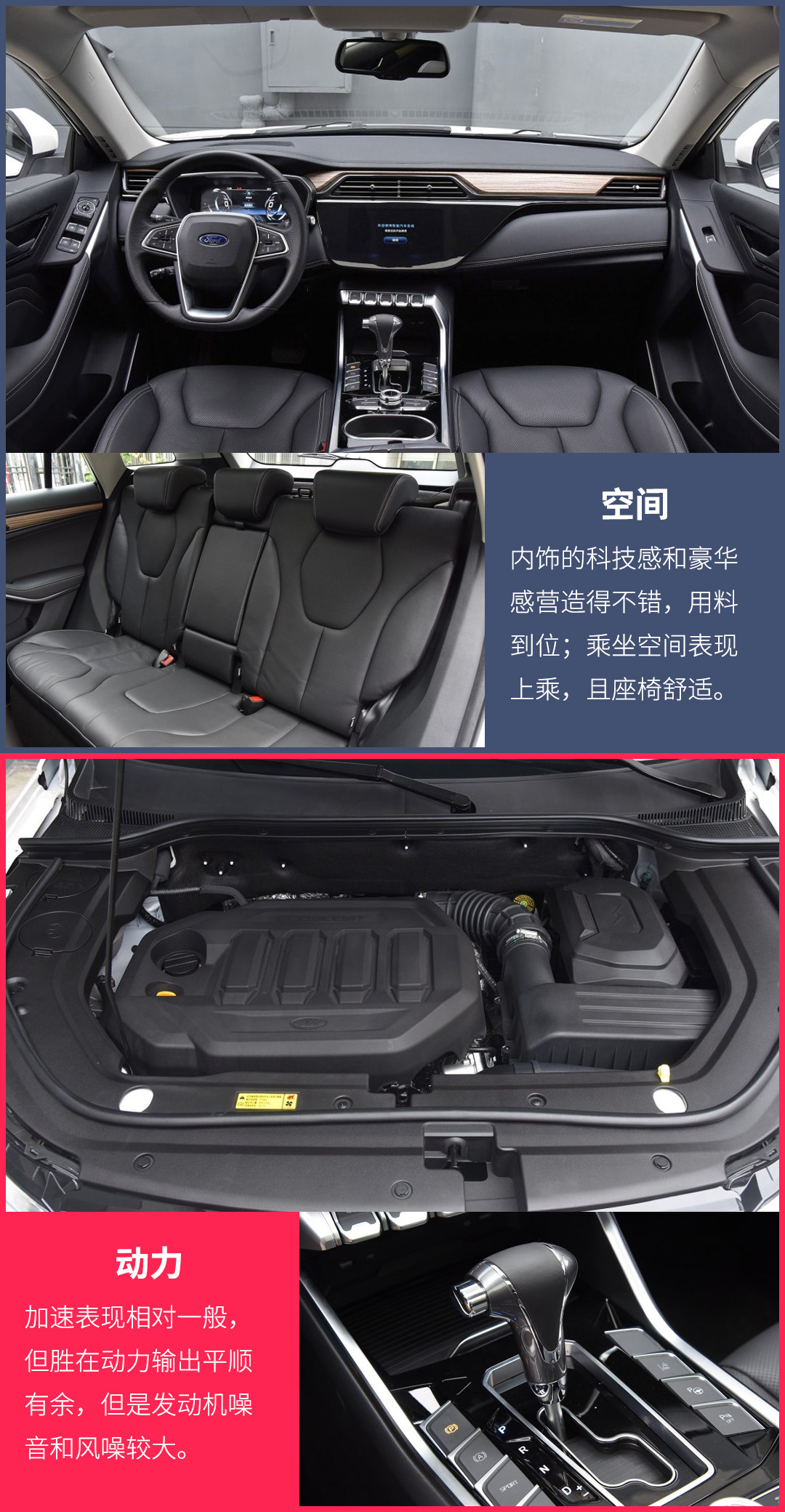 相比起外观,内饰更让人眼前一亮,无论是豪华感还是科技感,都相当到位,用料也是福特一直以来很重视的,多处采用皮质、木纹、哑光镀铬等材质。并搭载全新的信息娱乐系统、福特Co-Pilot360智行驾驶辅助系统以及带有4G LTE无线热点功能的“福特派互联”