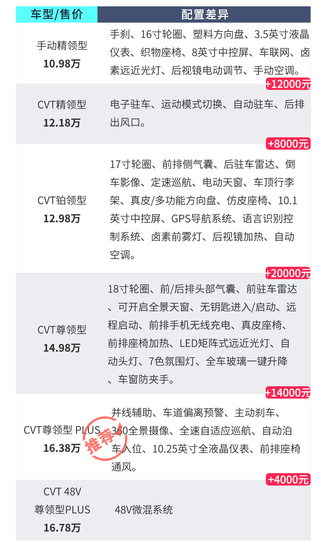 首先唯一的手动挡车型,虽然价格很低,但配置真没啥看点。我们可以看到中高配车型之间的配置是差很远的,差价还算合理。其实我们考虑这款车的配置时,有一点非常关键,就是这款车的最大卖点不是外观设计,不是驾驶体验,不是空间表现,而是内饰设计和各种配置。所以既然选择了这款车,那就尽可能往高配上选,尽可能体验到所有亮点配置。当然预算有限的话12.98万的铂领型也非常值得推荐。