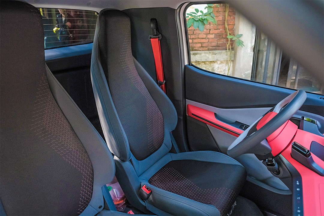 座椅支持前后调节和靠背调节,但是不支持高低调节的,所以坐姿可能会偏高一点,但同时视野也相当好,教授身高1.7米就还好,还有一拳多点的空间,并不算局促,再高一点的话就会顶头,座椅还加入了一些图案装饰,加上红色的安全带还是蛮有意思的。