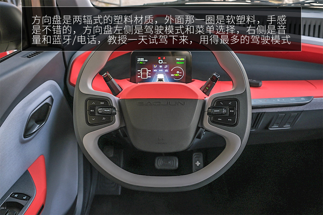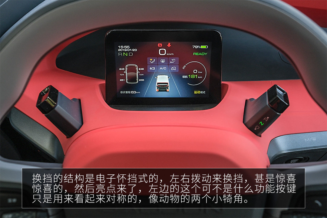 这里还有几个有意思的点,换挡的结构是电子怀挡式的,左右拨动来换挡,这也是挺惊喜的,此件还没见过这样的换挡方式;然后亮点来了,左边的这个可不是什么功能按键,只是用来看起来对称的,像动物的两个小犄角。