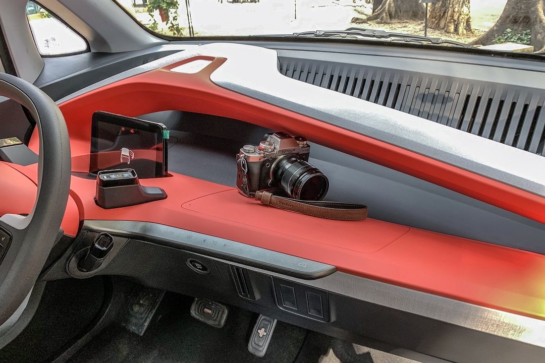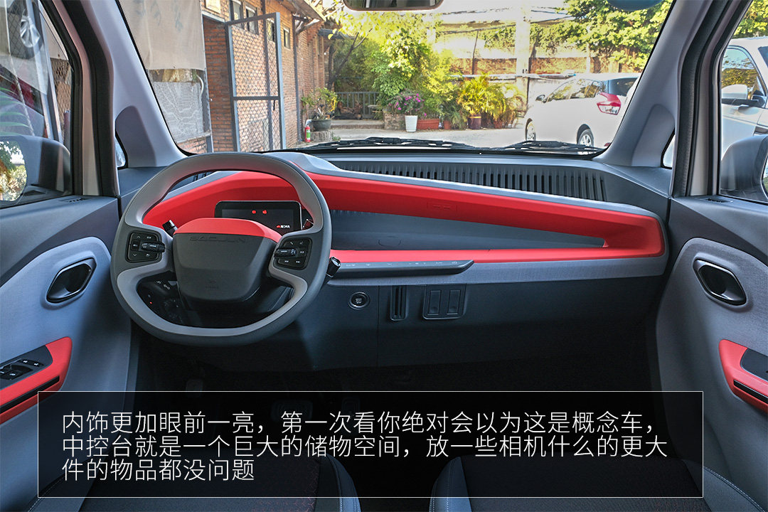 内饰更加眼前一亮,第一次看你绝对会以为这是概念车,中控就是一个巨大的红色锐角三角形,跟特斯拉Model 3一样简洁,只是没有中控大屏,中控台变成了一个巨大的储物空间,放一些相机什么的更大件的物品都没问题,还没想到居然可以这么玩。