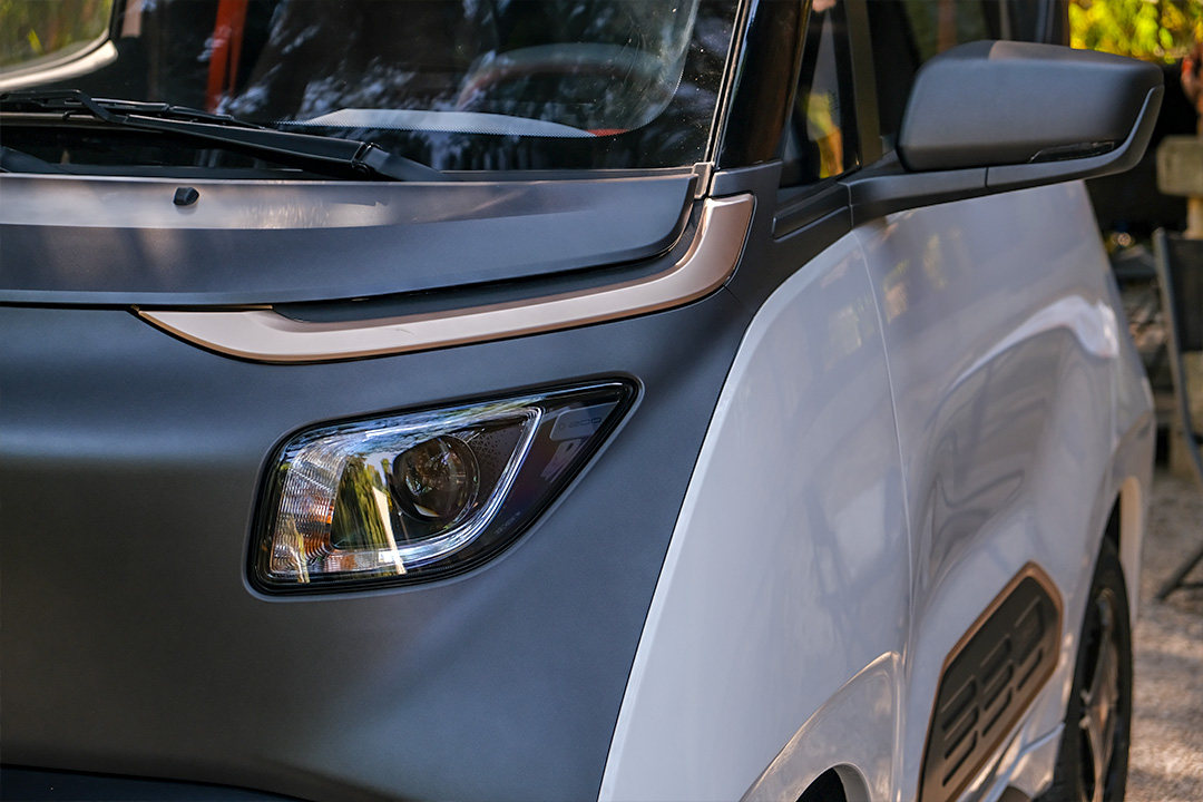 教授尤其喜欢Smart这种有趣的小车,但E200远不止有趣,而是可以用“科幻”来形容,先从外观说起,因为是电动车,前脸其实不需要做什么扰流或者通风的设计,所以前脸除了两个灯是发挥着实质性的座椅,其余全是装饰的。