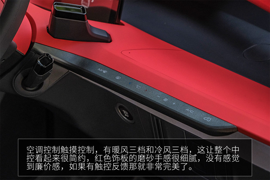 空调控制触摸控制,有暖风三档和冷风三档,这让整个中控看起来很简约,红色饰板的磨砂手感很细腻,没有感觉到廉价感,如果有触控反馈那就非常完美了。