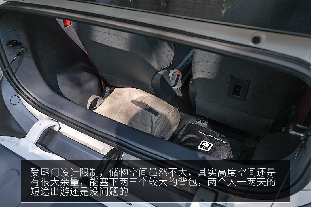 受尾门设计限制,储物空间虽然不大,其实高度空间还是有很大余量,能塞下两三个较大的背包,两个人一两天的短途出游还是没问题。
