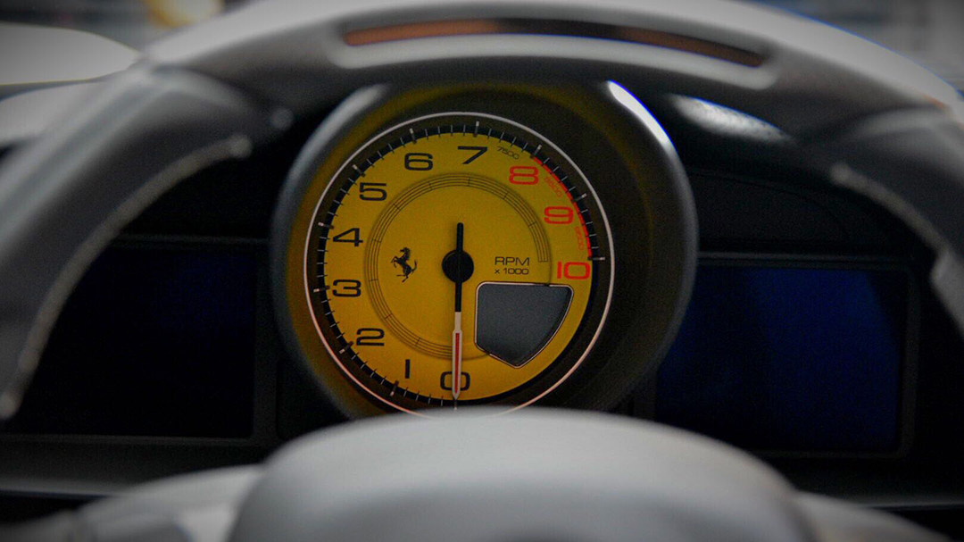 法拉利的美态是一种工业设计之美以及机械暴力之美,充斥了让你肾上腺素飙升的元素,平底式方向盘的红色模式切换旋钮,中置黄底转速表,皮带式门把手以及超大尺寸的固定式换挡拨片,驾驶它是一件仪式感很强的事情。