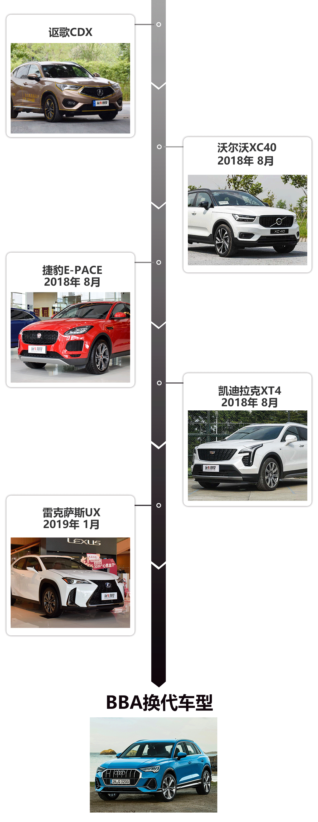 我们先看看整个豪华品牌紧凑型SUV的换代先后顺序,一线BBA的三款:Q3、GLA、X1仍然没换代,讴歌的CDX、英菲尼迪QX30早就出了,离换代仍太远;其次二线的捷豹E-PACE、沃尔沃XC40、凯迪拉克XT4都是去年8月。