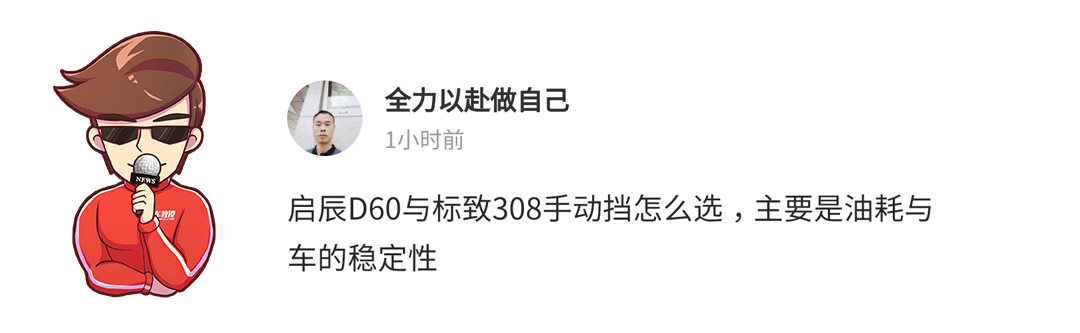 首先直接告诉你答案,选启辰D60。标致308其实还算是一辆比较不错的车型,但是法系车都是有一个共性的,就是前两三年,基本没有问题,但是两三年过后就会有源源不断的毛病出现,所以也不用考虑油耗了。而启辰D60是和日产轩逸同技术平台开发的,1.6L发动机也直接用轩逸的。作为轿车销量王之一,可靠性和燃油经济性都是轩逸的卖点,所以启辰D60多多少少也能继承。