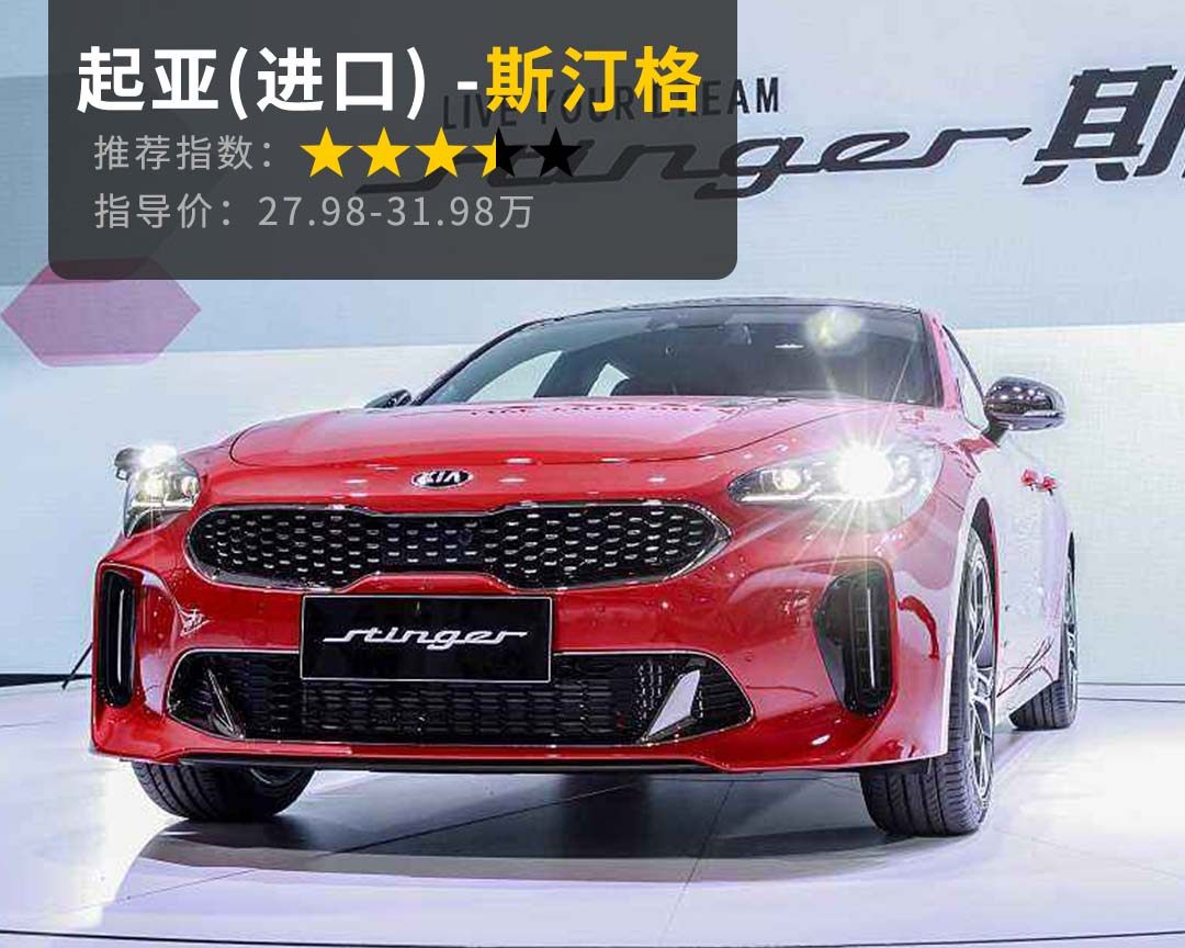 推荐理由:斯汀格是起亚打造的一款类似GT的性能车型,自北美车展亮相以来,3.3T双涡轮增压发动机、5.1秒破百、前置后驱等标签,被冠上了起亚“最强性能量产车型”。不过,国内进口版本车型只有2.0T版本车型,中型的价格,却站在了中大型车型领域。有着起亚K5的类似设计语言,但斯汀格给人的气场更足,更能讨消费者的好感,尤其是后面四出的排气管。走进车舱,布局清晰的内饰曾获得沃德十佳内饰的称号,触摸质感,看得到的地方,几乎都给了很大面子。最重要的还是运动底子,2.0T动力调教偏激进类型,轮胎刹车等都十分强调运动,四个刹车盘均采用了运动品牌的Brembo的刹车系统。
