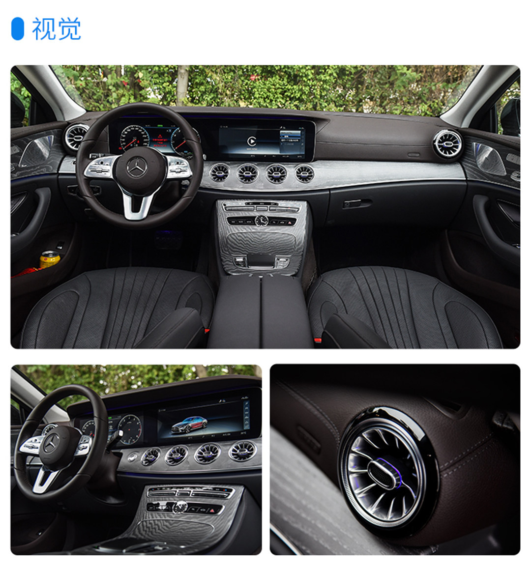 刚才说到的光影艺术,在车内部分奔驰就很有话语权了,64色的氛围灯与S级一样炫彩夺目,就连空调出风口内部也能泛着一圈蓝色光晕,我们戏称它为“燃气炉”。