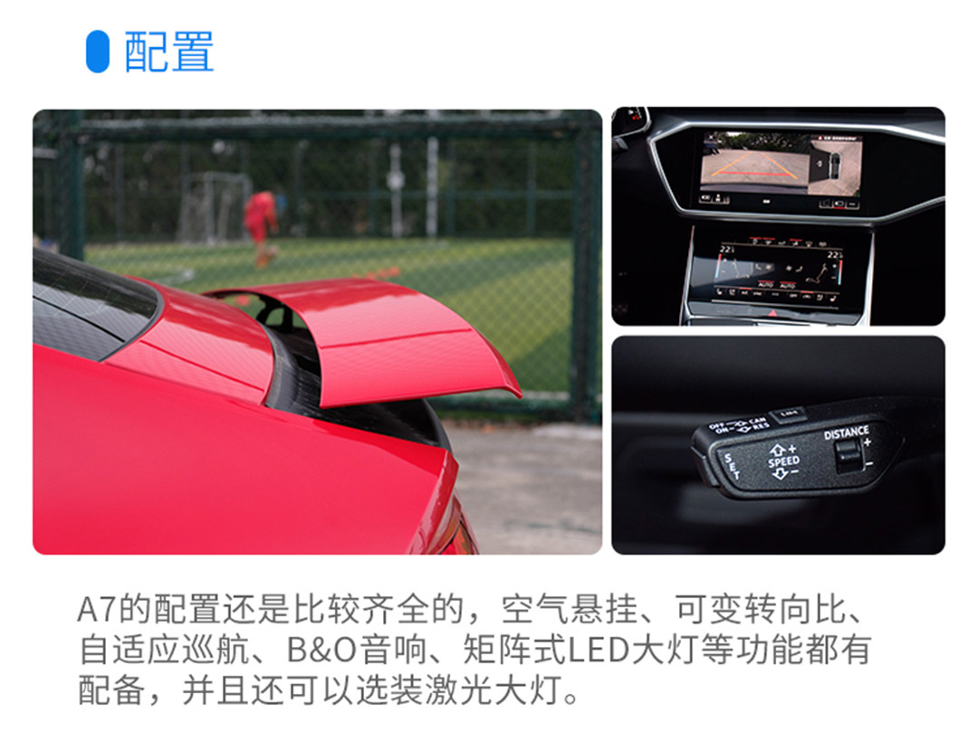 配置部分,A7的装备很齐全,矩阵式LED大灯和电动后尾门是全系标配,而如我们的高配车型,还带有空气悬挂、自适应巡航、B&O音响,同时还可选装激光大灯。