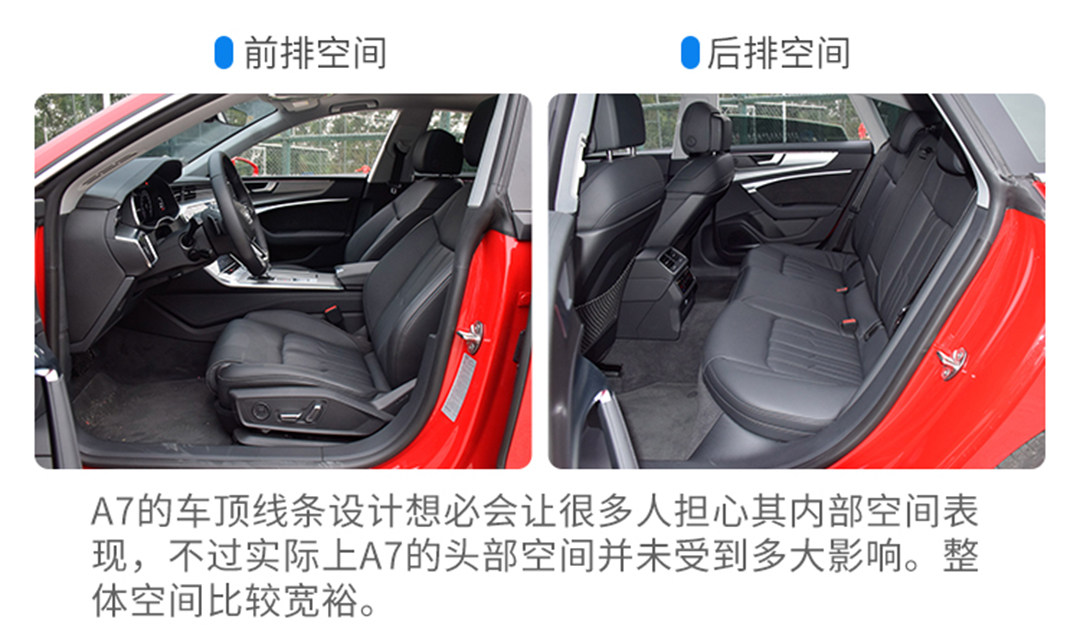 但A7与CLS是我们所谓的四门Grand Coupe,自然要评价一下它们的空间表现。受限于造型,两车的后排头部空间都比较有限。但在此部分A7的空间要相对更从容,腿部空间则相反,毕竟CLS在车长和轴距上都更有优势。