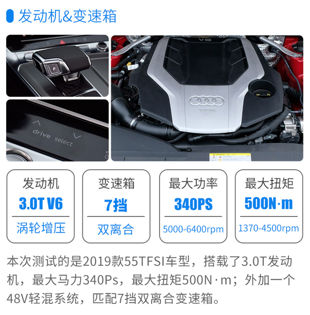 在动力的设定上,A7与CLS风格取向不同,其中A7目前提供的是3.0T V6涡轮增压发动机,最大马力340Ps,最大扭矩500N·m,涡轮放置在V型夹角中间,同时配备了48V轻混系统。与发动机匹配的是7速双离合变速器。