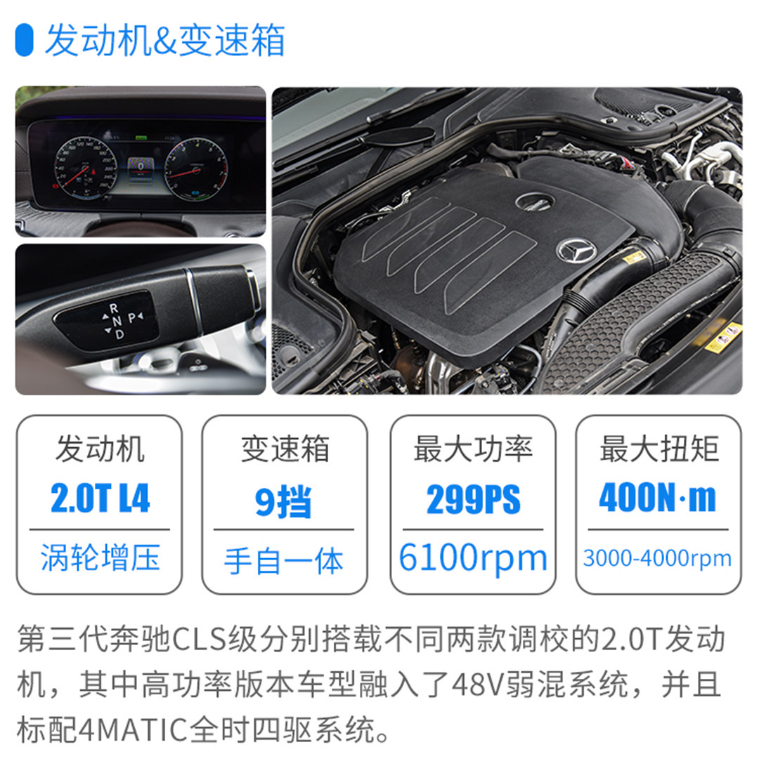 CLS则全系均为排量较小的2.0T版本,我们测试的版本是带有48V轻混系统的车型,发动机最大马力299Ps,最大扭矩400N·m,匹配9AT变速器。