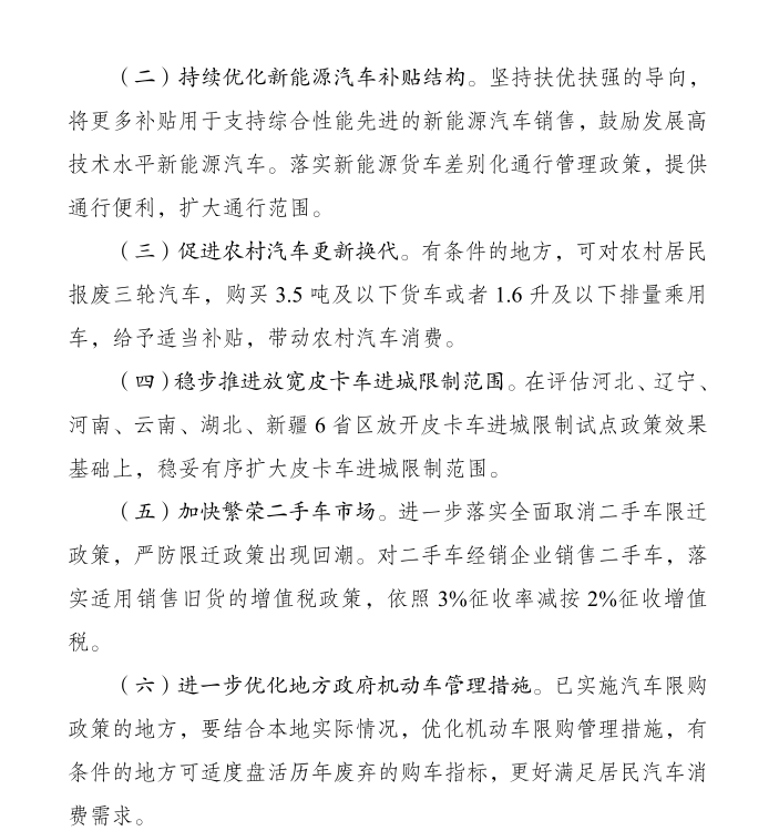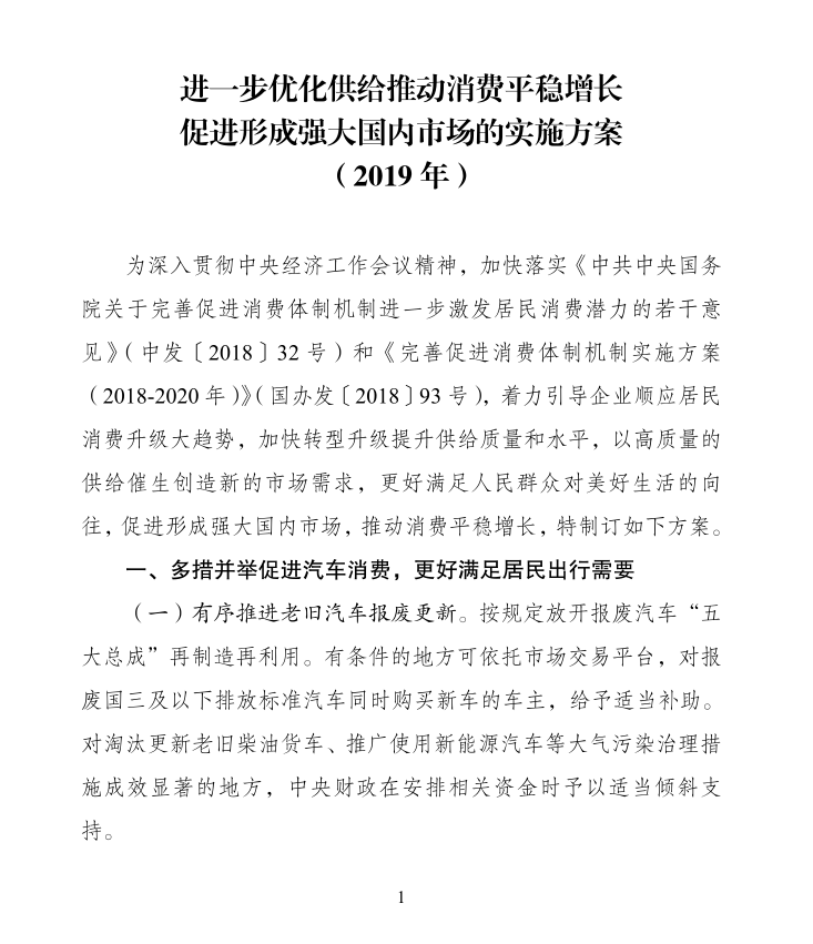 国家发改委等十部委官方在1月28日联合发布《进一步优化共计推动消费平稳增长促进形成强大国内市场的实施方案(2019年)》。《方案》的第一部分便是提及促进汽车消费的举措;《方案》提出,在老旧汽车报废更新、持续优化新能源汽车补贴结构、促进农村更新换代、放宽皮卡车进城限制范围、加快繁荣二手车市场、和优化地方政府机动车管理措施等方面都有相应的举措。同时,放宽皮卡车进城、繁荣二手车市场这两项相信将会是众多消费者更为关心的措施。在2018年,中国汽车消费遭遇了连续二十多年来的首次受挫,十部委在新年前夕发布该《方案》,似乎也在预示着在2019年,为了让市场重新回暖,将会有更多政策层面的引导。(截图源自《方案》原文)