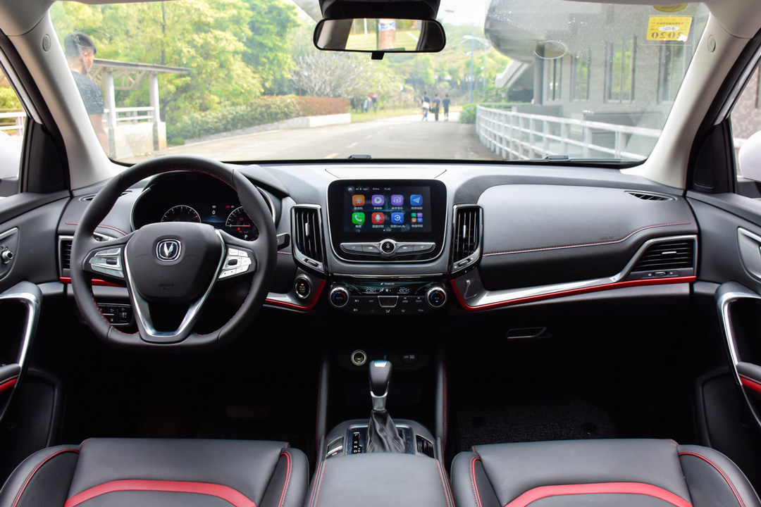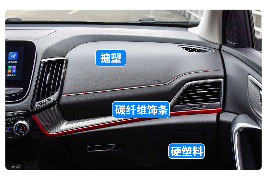 长安CS55在中控台上方采用了大面积的软性搪塑材质,并且在搪塑材质上还压制出红色缝线加以点缀。而中控台下半部分则采用了碳纤维饰条和硬塑料材质,整体给人的手感还不错,做工、用料都达到了该级别车型应有的水平。