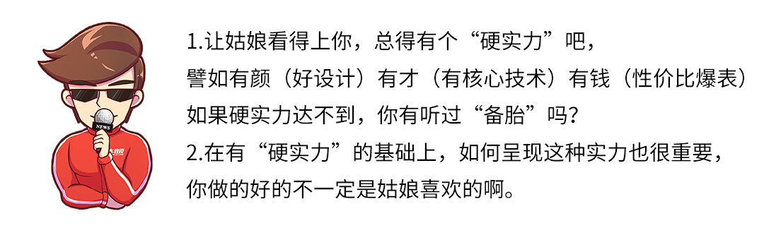 不管是贩卖产品还是贩卖情怀,向所有人售卖还是向圈层群体售卖,让明星代言还是让网红代言。结论只有一个:我的车是最年轻的!在没做到劳斯莱斯那个级别之前,一个不年轻的产品也许就代表了没有价值。“漂亮的车就是好车”——这句话不敢说100%适用,90%应该有吧?